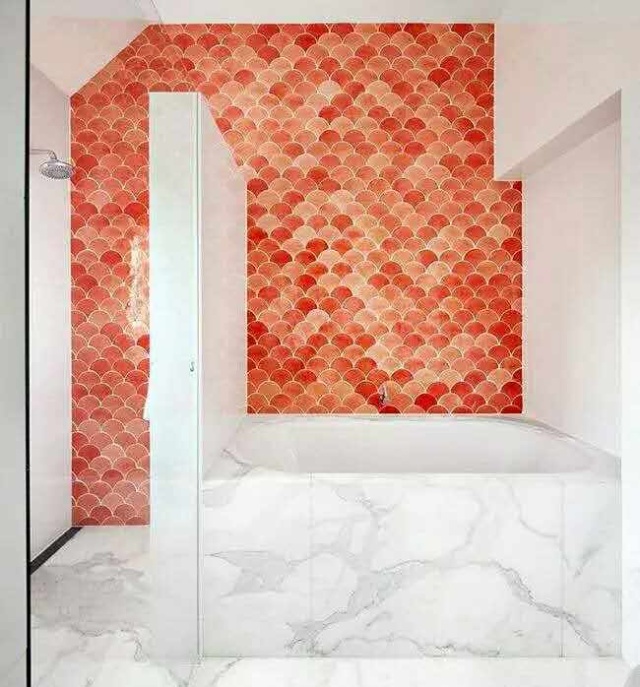 在衛生間里砌一面墻,貼上瓷磚,淋浴和浴缸隔斷開來,墻上可以掛毛巾,整個空間干凈、明亮,這是墻式隔斷很好的運用方法。