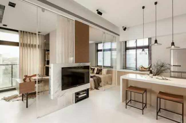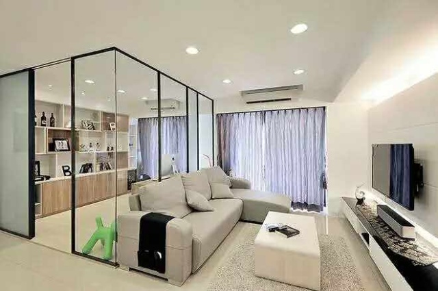 透明玻璃隔斷使房間顯得通透、明亮,有時會忽略它的存在,一不小心撞到上面。