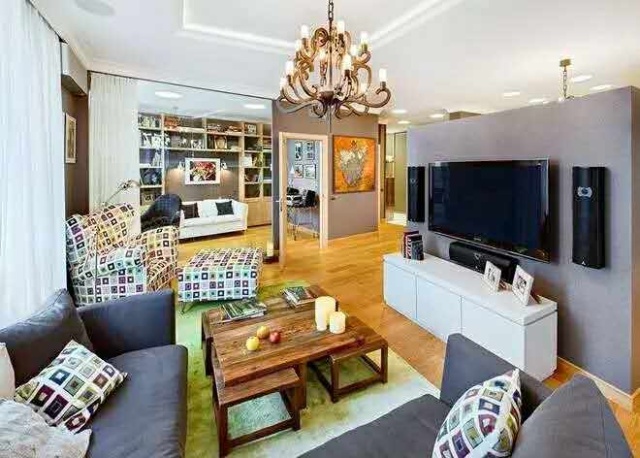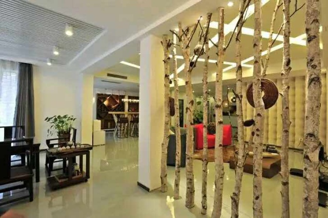 兩處隔斷圍出獨立的客廳空間,木質沙發、座椅和隔斷,客廳多了一份朦朧和詩意。