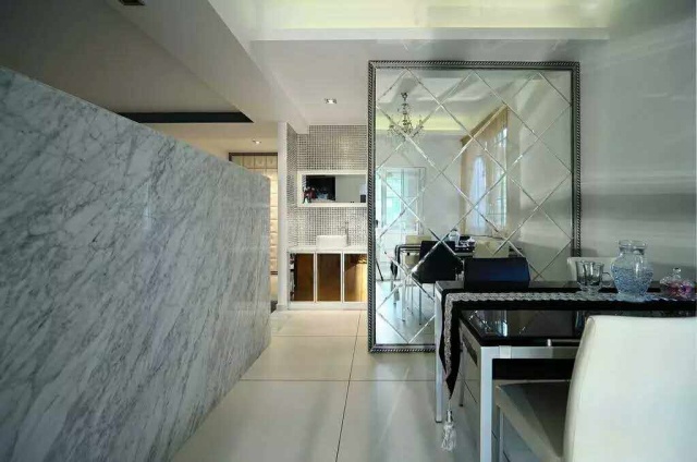 菱形格子鏡面隔斷,搭配黑白餐桌椅很有現代感。