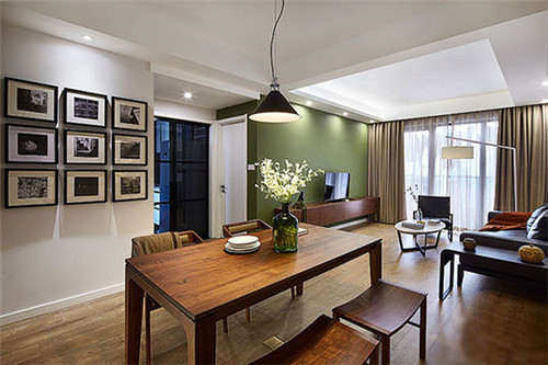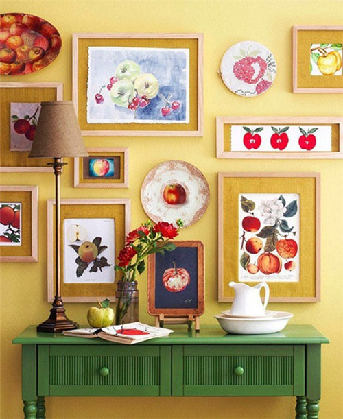 照片墻的設計也不能忽略墻面色彩的搭配,米黃色墻面搭配綠色小邊桌,溫暖而不失清新,可以選用原木邊框和暖色底紙,掛照片或者更有藝術感的畫作都是不錯的搭配。