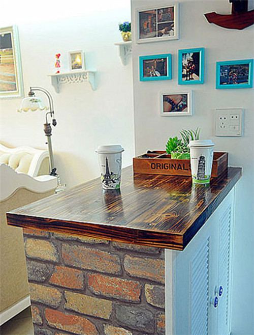 吧臺旁的墻面雖然面積不大,也可以用來好好裝飾一番。把一些小幅的照片用不同顏色的邊框包邊,隨意地掛在墻上,顯得隨性而又溫馨。