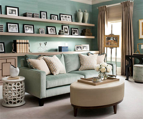 在沙發背景墻上安裝擱板,不但可以用作照片展示,也可以用來收納其他物品,一舉兩得,美觀性與實用性俱佳。