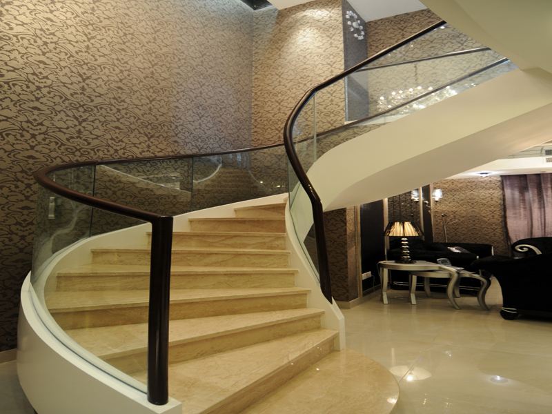 在大戶型復式房或別墅中,設計師經常采用大理石踏步搭配實木欄桿造型,用純實木踏步搭配實木欄桿的也不少。為了進一步體現出華麗感,樓梯耳朵護欄大都選用手工木雕為立柱。