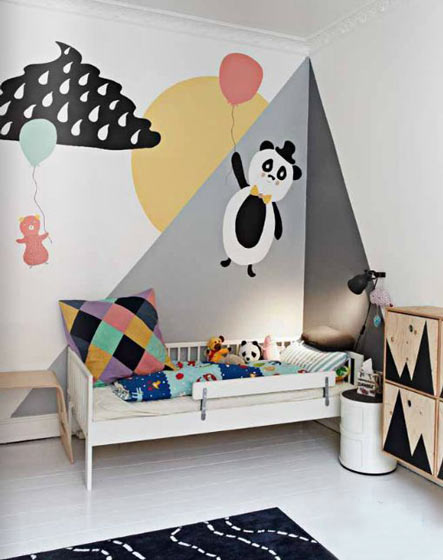 這個兒童房的設計簡直就是手繪撐起來的效果,靠墻放置的小床其實是平淡無奇的,有了手繪的點綴整體效果一下就出來了。