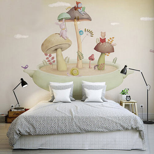 這個床頭背景墻簡直就是整個房間的亮點,擬人化的小動物在一朵朵蘑菇上看書,精致的設計讓整個房間都充滿了童話的氣息。