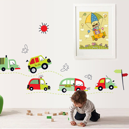 寶貝在地上爬來爬去,墻上是他最愛的小汽車,各種車輛有秩序的通過各種指示牌是不是很萌。