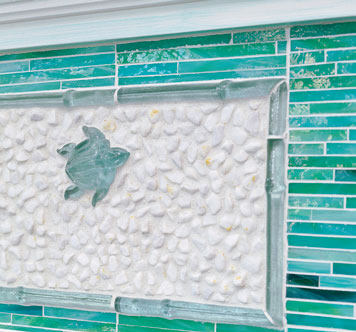 壁爐架上的玻璃磚晶瑩剔透,宛若大海洗禮般干凈自然。將同色系不同色調的藍色、綠色拼貼在一起,并把可愛的魚兒、海龜鑲嵌在其中,會增添不少童趣。