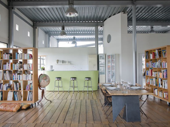 生活區(qū)都是開放式的,廚房,客廳和餐廳都是可以自然穿越,大多用高挑的書架隔開。不按常規(guī)的格局布置。大書架是亮點(diǎn),空間夠大,書架也布置得很隨意,不必遷就空間。