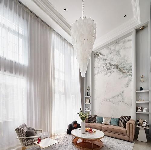 客廳保留了原戶型的挑空優勢,一整面大落地窗,一盞水晶長吊燈垂落,大氣開闊;客廳的背景墻用進口大理石壁紙來代替大理石,地毯和布藝沙發的搭配,讓整個空間更為柔和,浪漫慵懶。